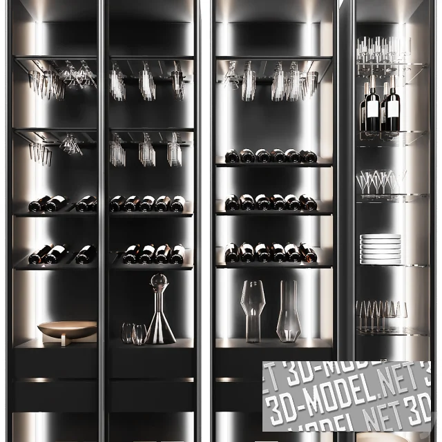 Современные винные витрины для интегрирования в мебельные шкафы или стеновые ниши. Представлены двухстворчатая (шириной 90см); одностворчатые (60 и 40см). Стеклянные створки обрамлены тонким серебристым алюминиевым профилем. Внутреннее пространство разделено полками, в двух шкафах (90см и 60см) смонтированы небольшие выдвижные черные секции. По вертикальным сопряжениям боковых плоскостей корпуса и задней стенки смонтирована подсветка. На полках размещены коробки и бутылки с вином, декантеры, посуда бокалы разного назначения.