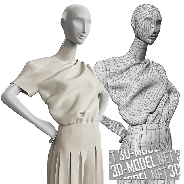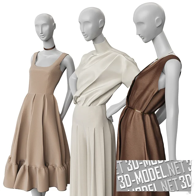 Три современных белых женских манекена для витрин и торговых залов. На манекенах бежевый сарафан с чокером и «медные» туфли на каблуках, жемчужно-белые длинные брюки со складками и блузка с высокой горловиной, темно-бронзовое вечернее платье до пола, без рукавов и с глубоким декольте.
