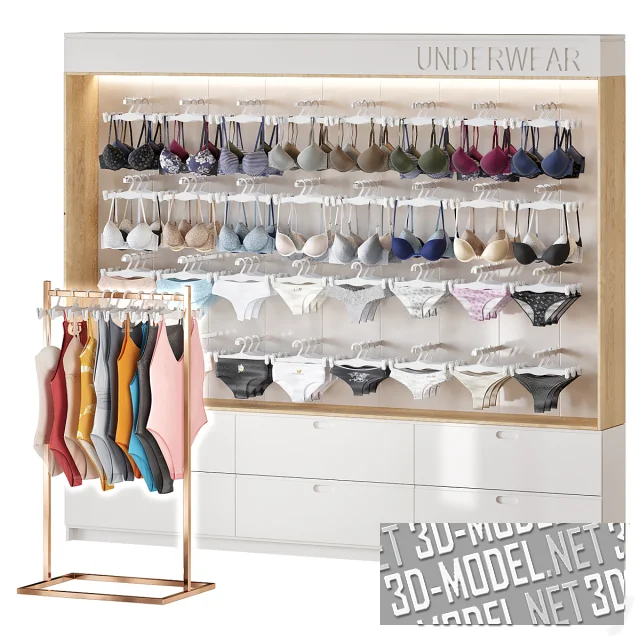 Современный шкаф-витрина и деревянная стойка с купальниками на вешалках для магазина женского нижнего белья. Шкаф скомбинирован из плит (с текстурой дерева и белого цвета). В нижней части витрины обустроено шесть больших выдвижных ящиков с белыми фасадами. На верхней панели шкафа надпись «UNDERWEAR».