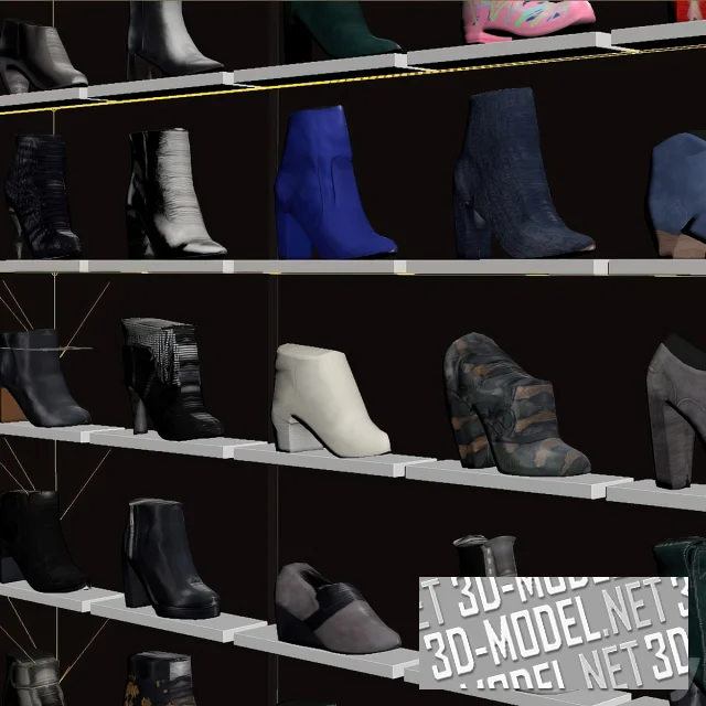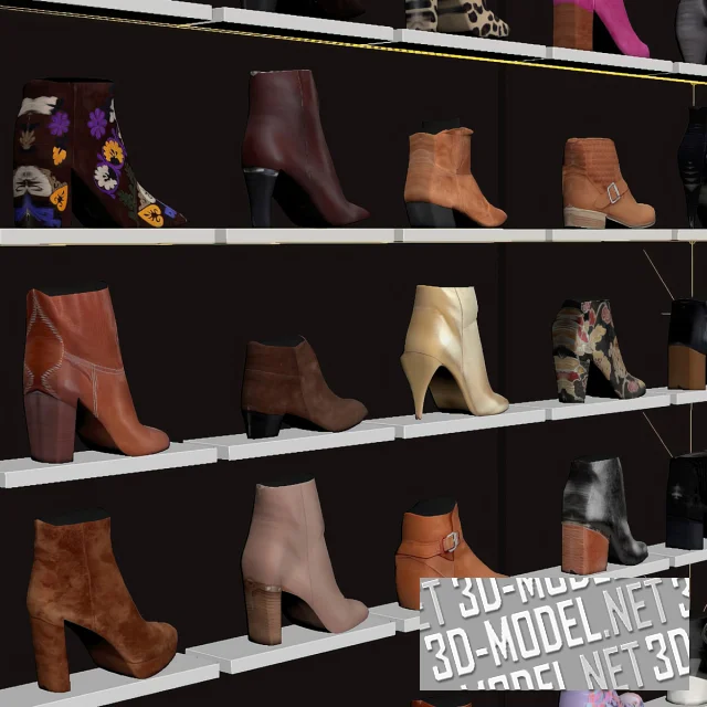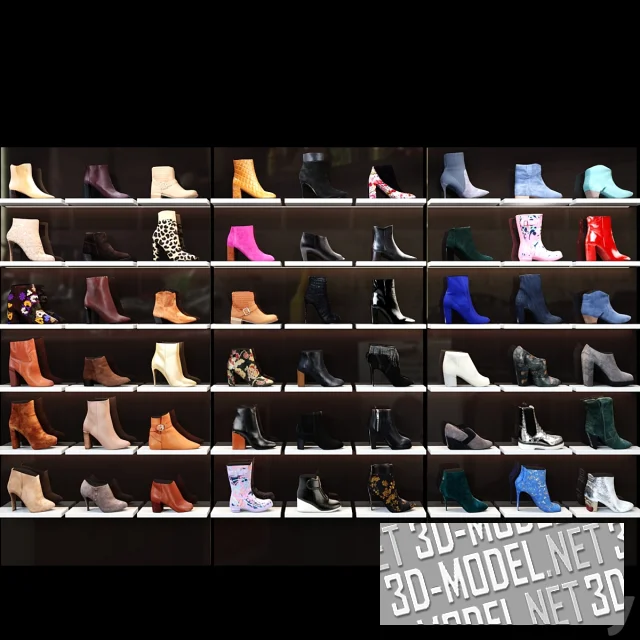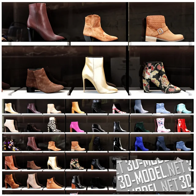 Декор для интерьера магазина женской обуви. В комплекте 3три стеллажа и 54 единицы обуви. Ботильоны, туфли, сапожки - множество моделей разного цвета в ассортименте.