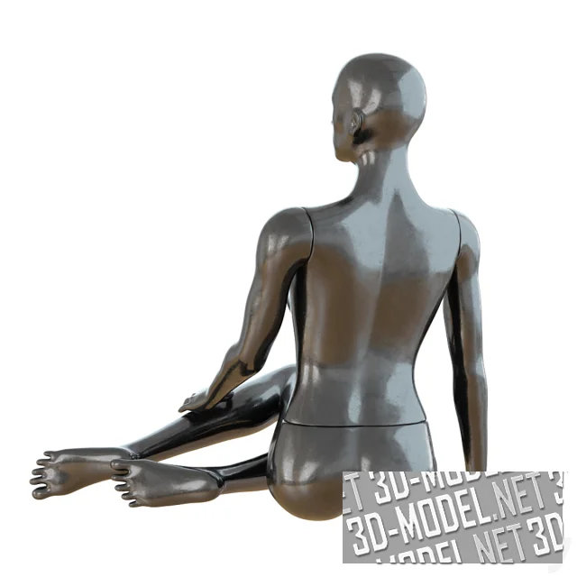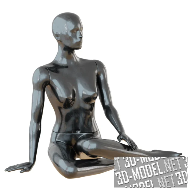 Выполненный в выразительном черном металлизированном цвете с глянцевой поверхностью женский манекен, сидящий на полу. Плавные формы и анатомически точные пропорции подчеркивают эстетику современного дизайна. Манекен передает ощущение спокойствия и уравновешенности благодаря естественной позе с расслабленными руками и перекрещенными ногами.