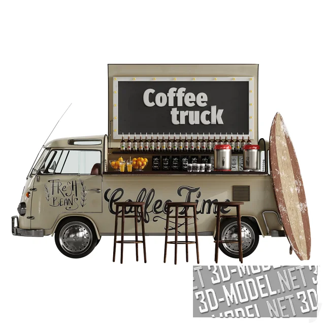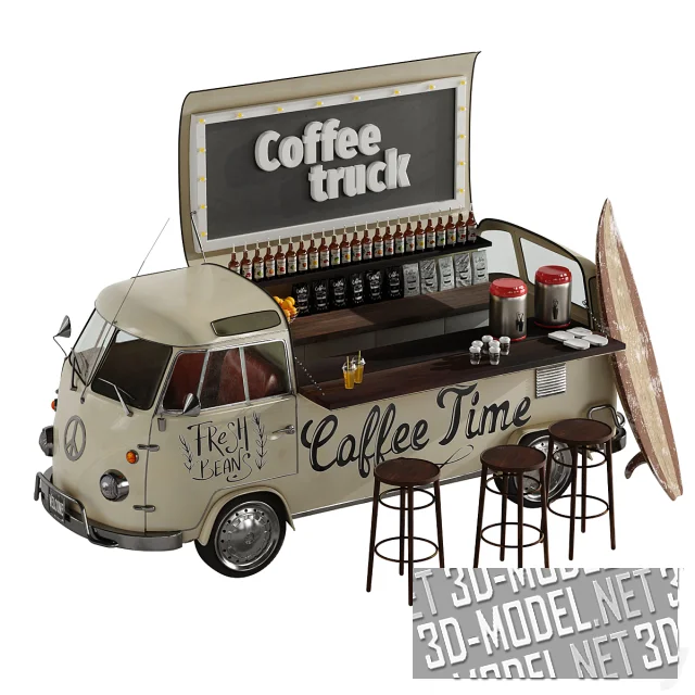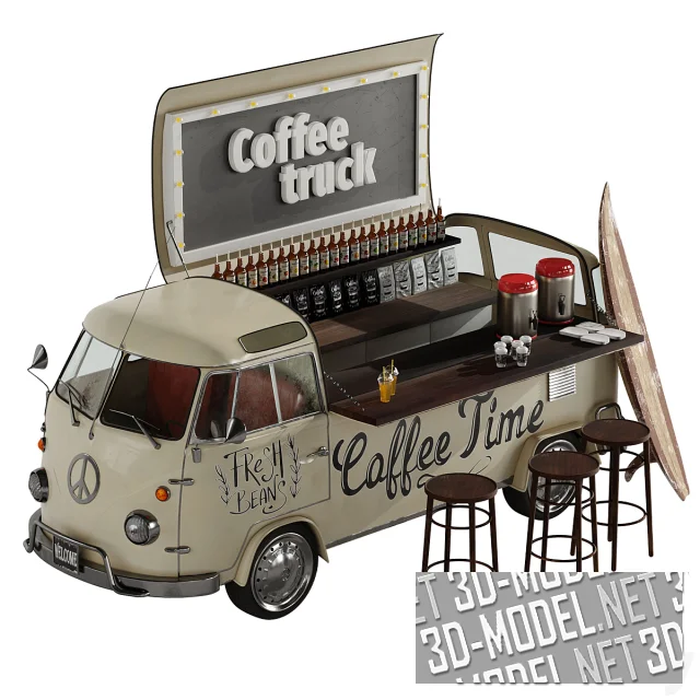 Этот мобильный кофе-бар выполнен в формате классического ретро-фургона, переоборудованного под полноценную кофейную станцию. Внутреннее оснащение включает стойку с деревянной барной поверхностью, дозаторы сиропов, контейнеры для зерна, профессиональные аппараты для приготовлени напитков и открытую витрину с цитрусами.