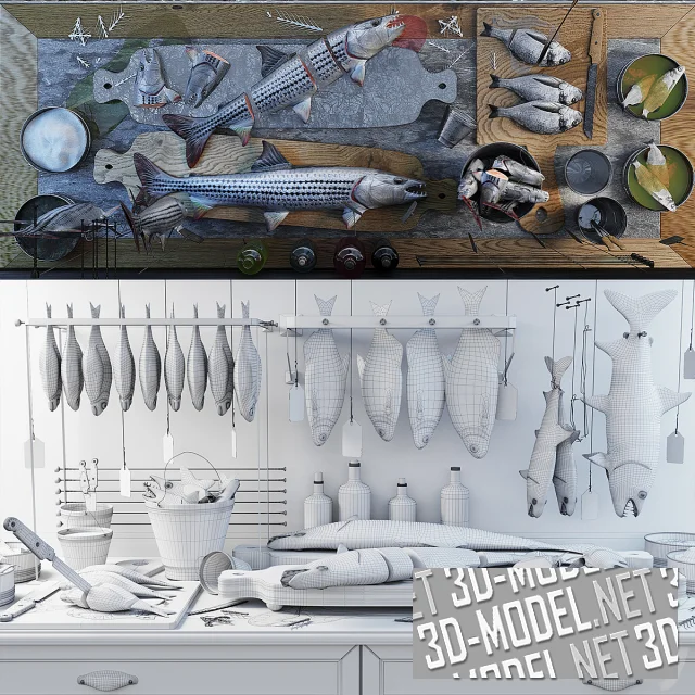 Витрина рыночной рыбной лавки с черным баннером над нишей. На баннере белым мелом написан рецепт рыбного блюда из дорадо. На столешнице в нише лежат различные рыбы на разделочных досках, подносе и в жестяных ведрах. Стоят бутылки, соль в жестяной емкости, разделочные ножи. На фоне черного рустикального задника в нише висят горизонтальные держатели с развешанной рыбой (дорадо, лещ, тигровая рыба).