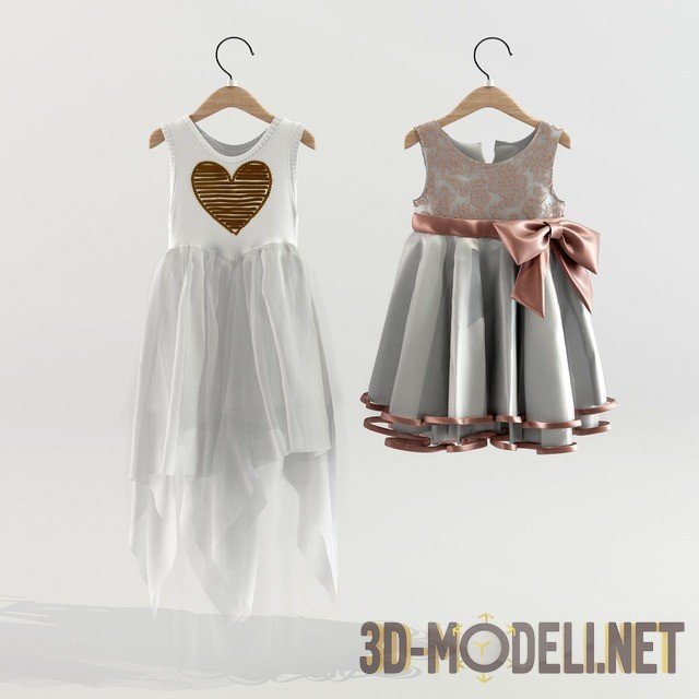 3d модель двух очаровательных платьиц для девочек, представленных в вариантах на манекенах и вешалках. Одно платьице сшито из серебристо-серого шелка с вышитым лифом и поясом с большим бантом цвета молочного шоколада, другое прозрачное, удлиненное, многослойное, с аппликацией сердечка на лифе. При визуализации пространства детской комнаты для девочки младшего школьного возраста можно поставить манекены с этими платьями, и модель привнесет живость и достоверность в данный интерьер.