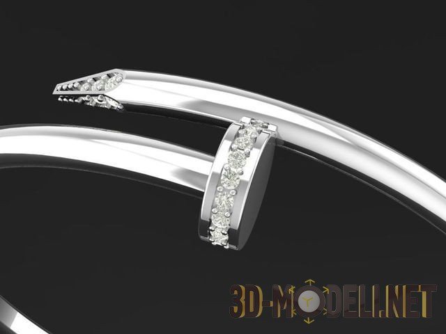 Изящное тоненькое кольцо из белого металла и браслет, составляют оригинальный комплект. Изделия выполнены в виде согнутого в кольцо гвоздя с шляпкой и острым, четырёхгранным кончиком. Торец шляпки и грани острия усыпаны мелкими бриллиантами. Браслет: