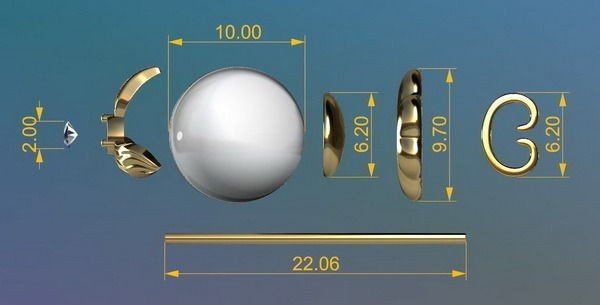 Небольшие золотые серьги с крупной жемчужиной и небольшим круглым бриллиантом в трёхлепестковой золотой розетке на «полюсе». Застёжка на «гвоздике» выполнена в виде четырёхлепесткового клевера. Классическое сочетание золота и белого жемчуга создаёт красивое, гармоничное ювелирное изделие. Жемчуг - 10 мм, круглые драгоценные камни - 2 мм