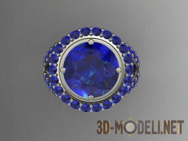 Оригинальный перстень, сделанный из серебристого металла. Украшен крупным круглым камнем глубокого синего цвета. Множество мелких синих камешков размещены вокруг большого и по распоркам обода.