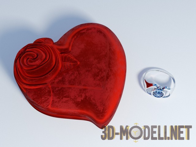 3d модель серебряного перстня с круглым сапфиром цвета ультрамарин, помещенного в ювелирную коробочку в форме сердца. Коробочка отделана красным бархатом снаружи и белым материалом изнутри. На верхней крышке коробочки находится выпуклая стилизованная роза. Композицию, созданную на основе или с участием этих предметов, можно использовать при создании открытки к Дню Святого Валентина или в других проектах.