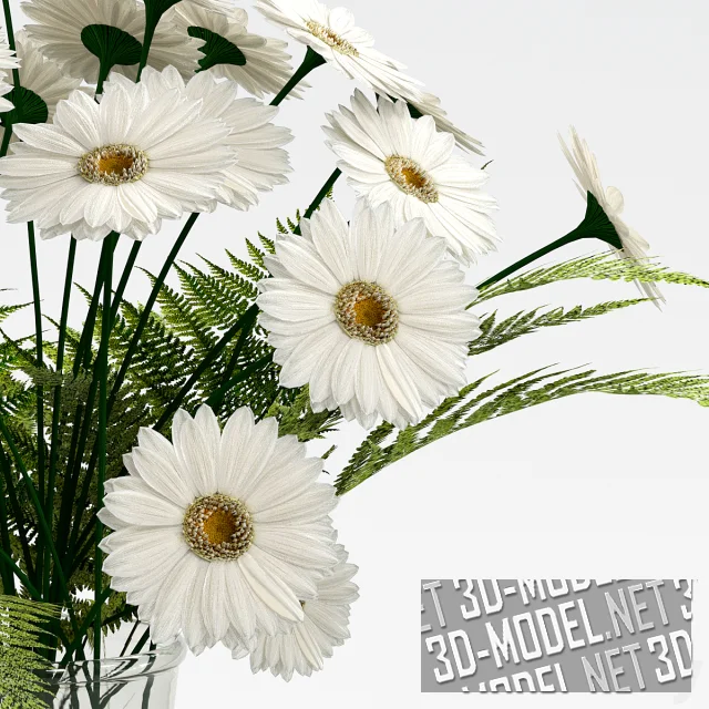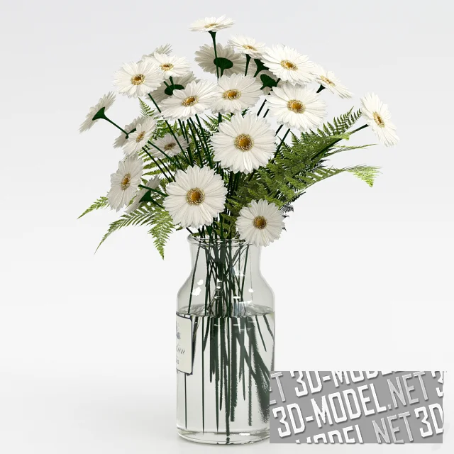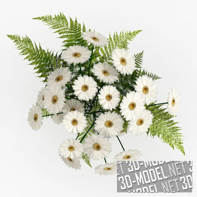 Милый букет с ромашками и листьями папоротника. Минималистичная стеклянная ваза является гармоничным дополнением. Эта привлекательная цветочная композиция украсит журнальный или обеденный стол в любом интерьере.