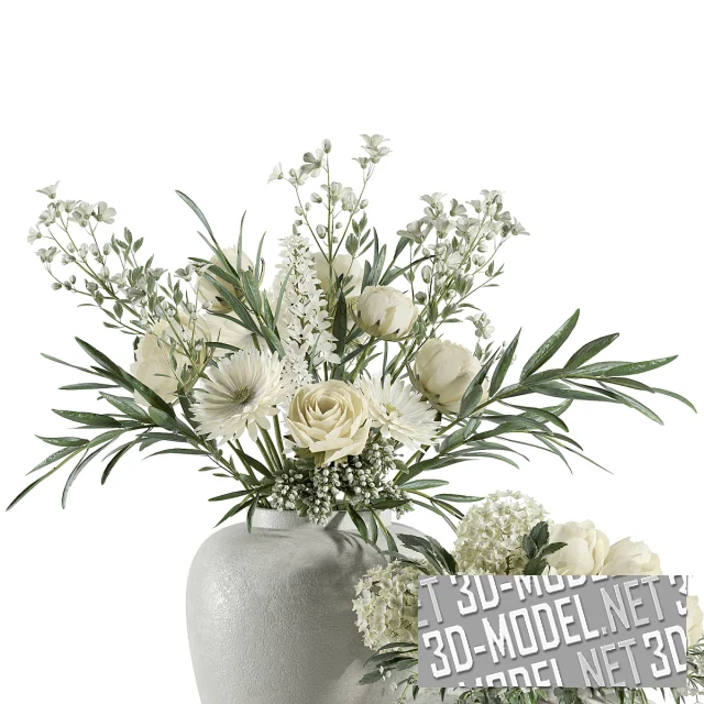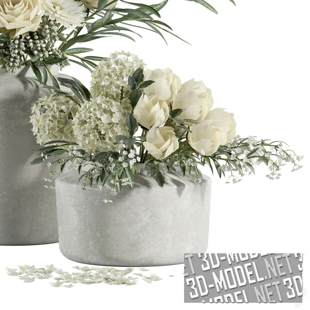 Изящные букеты, составленные преимущественно из белых цветов и зелени, в серых текстурированных вазах. Композиция включает розы, гортензии, гипсофилу и различные декоративные ветви.