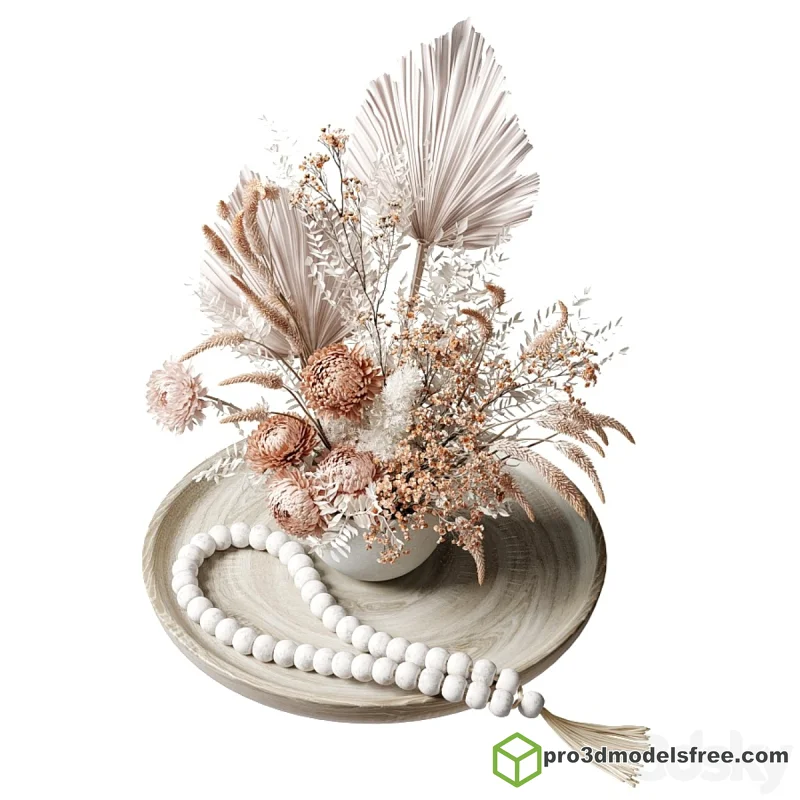 Букет размещен на деревянном подносе с мягкой, слегка выбеленной текстурой, что подчеркивает природный характер декора. Дополнительным акцентом служат декоративные бусы светлого цвета, аккуратно уложенные по краю подноса. Они добавляют композиции завершенность и визуальный ритм, не отвлекая внимание от основного элемента. Все предметы выглядят тщательно подобранными и объединенными общей стилистикой.