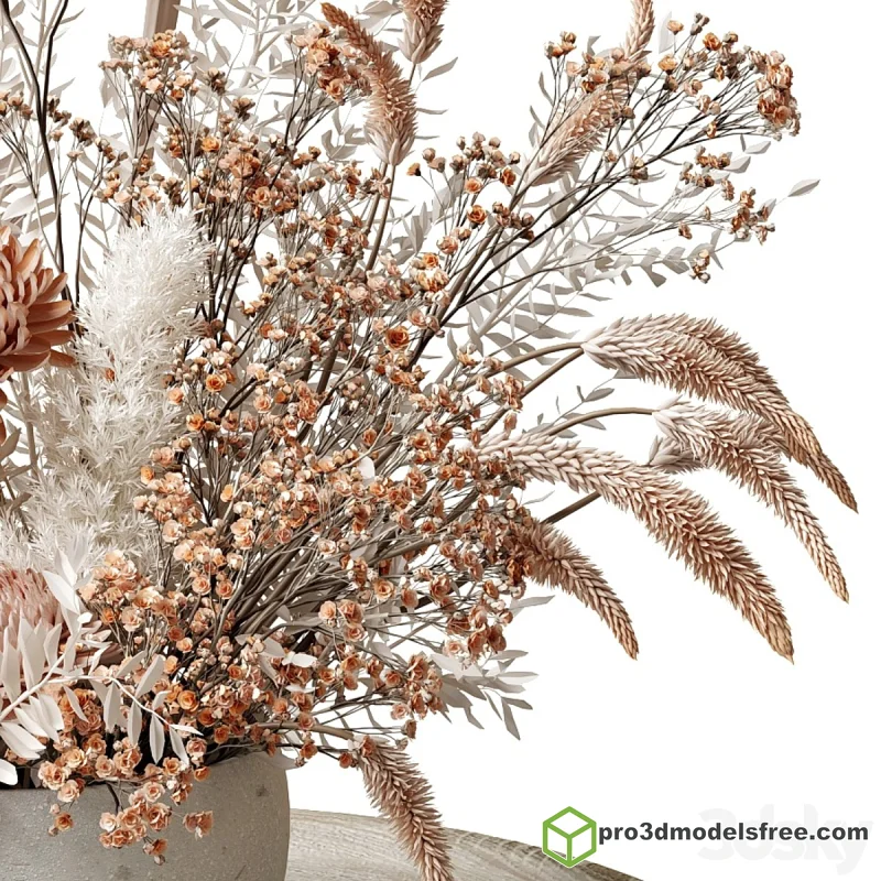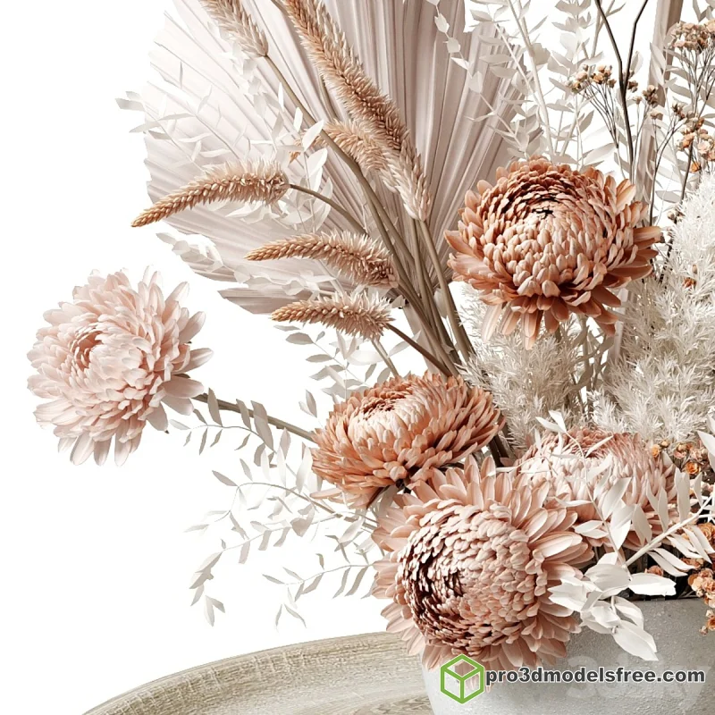 Декоративная композиция из сухоцветов, выполненная в спокойной, нейтральной цветовой гамме. В центре находится матовая округлая ваза светлого оттенка, в которой собран букет из высушенных растений с разной фактурой и формой. Крупные веерообразные листья, пушистые колоски, мелкие веточки с соцветиями и хризантемы создают многослойную и визуально богатую композицию, при этом она выглядит легкой и сбалансированной. Оттенки бежевого, пудрово-розового и молочного гармонично сочетаются между собой, создавая ощущение уюта и естественности.