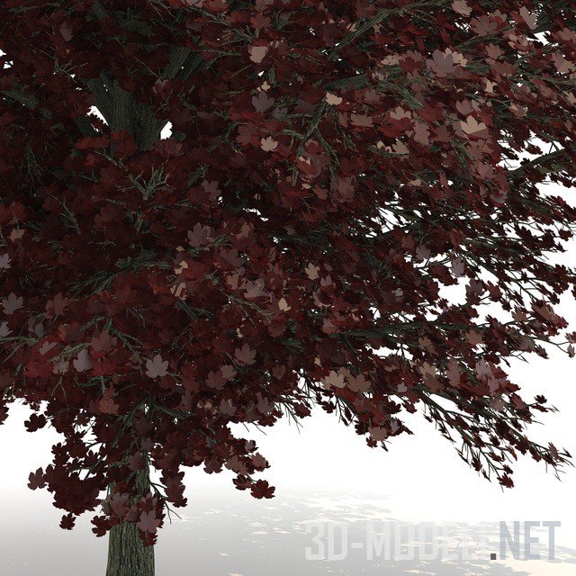 Acer rubrum). Густая шаровидная крона усыпана темно–красного цвета листьями с широкой резной листовой пластиной.