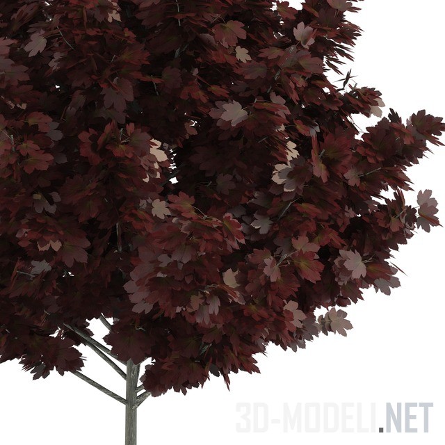 Acer rubrum) с аккуратной густой кроной и тонким прямым стволом. Листья – тёмно–красного цвета, с декоративной резной листовой пластиной.