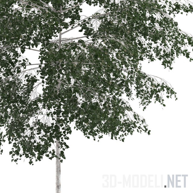 Betula pendula). Тонкий ствол с белой корой и характерными черными черточками. Крона пирамидальная, с повисшими ветками и густой зеленой листвой.
