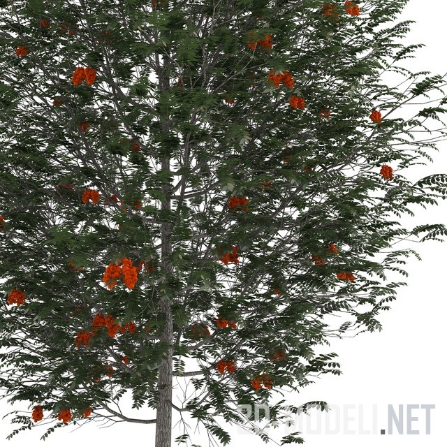 Sorbus aucuparia). Пирамидальная крона, раскинувшаяся на тонком стволе, усыпана кистями с яркими оранжевыми ягодами и тёмно–зелёной листвой.