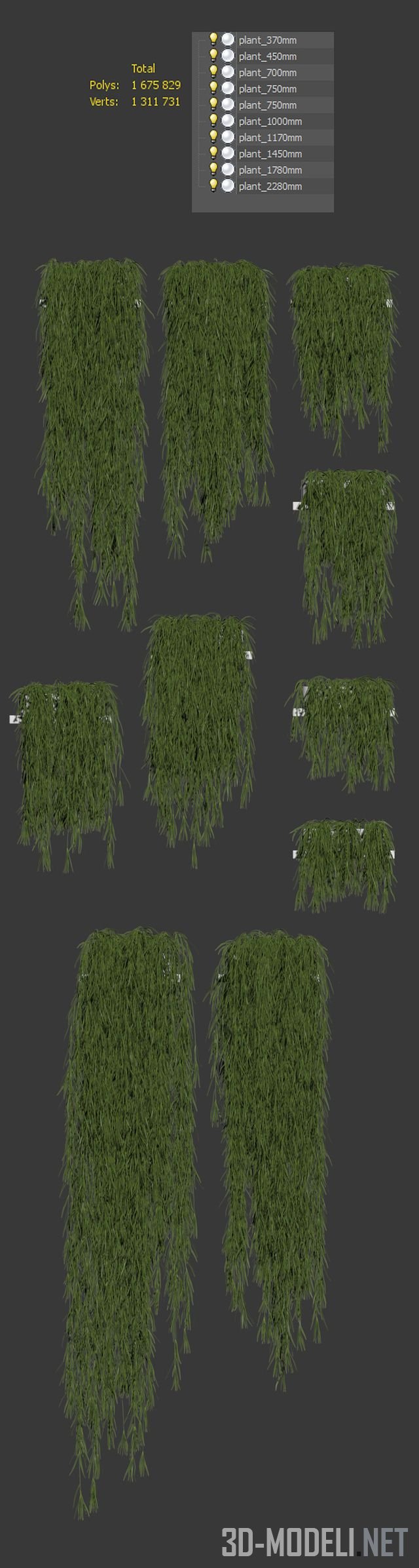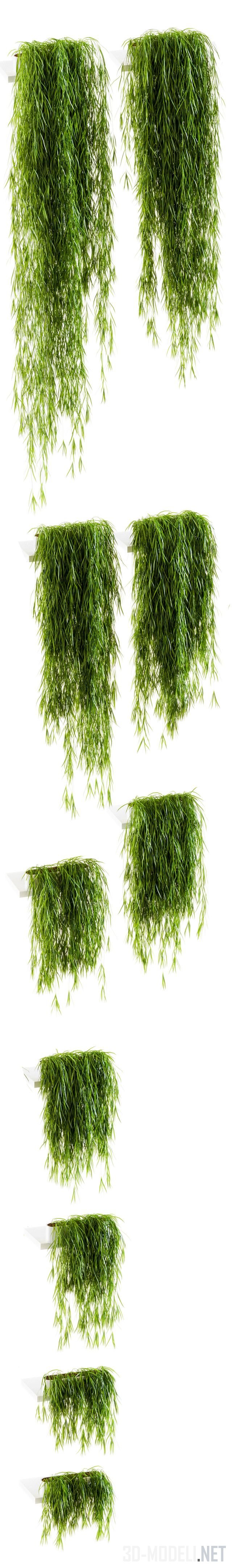 Аспарагус серповидный, с тонкими зелеными продолговатыми листиками. Десять вариантов размера ампельной формы этого растения представлены растущими из белых настенных горшков. Размеры: