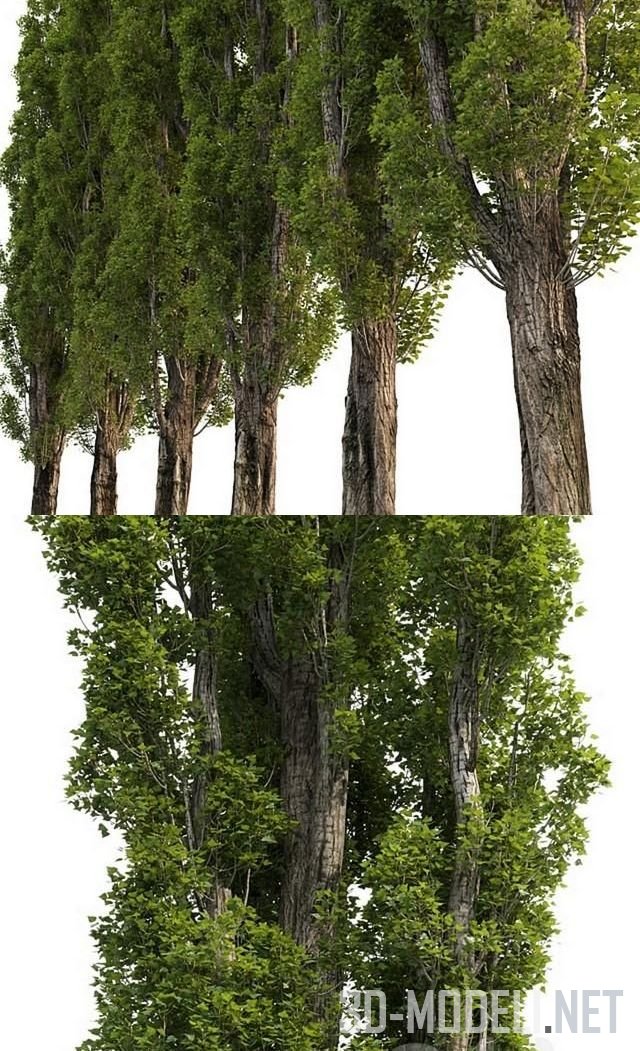 Реалистичная трехмерная модель Poplar Populus, дерево черный тополь. Высота тополя 24 метра, ствол диаметр 60 см. Геометрия, текстуры и материалы имеют правильные названия.