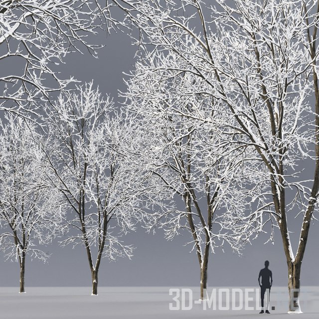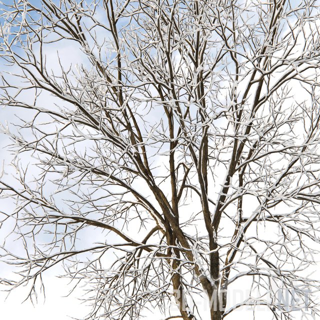 Дерево ясеня, в зимний период, без листьев, с присыпанными снегом ветками. Высота дерева - 15,5м.