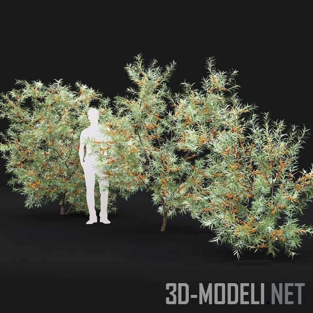 Sea Buckthorn), реалистичная трехмерная модель для экстерьерных проектов. Листья сделаны с использованием карты непрозрачности. Высота кустов: 1.8-2.5 м.