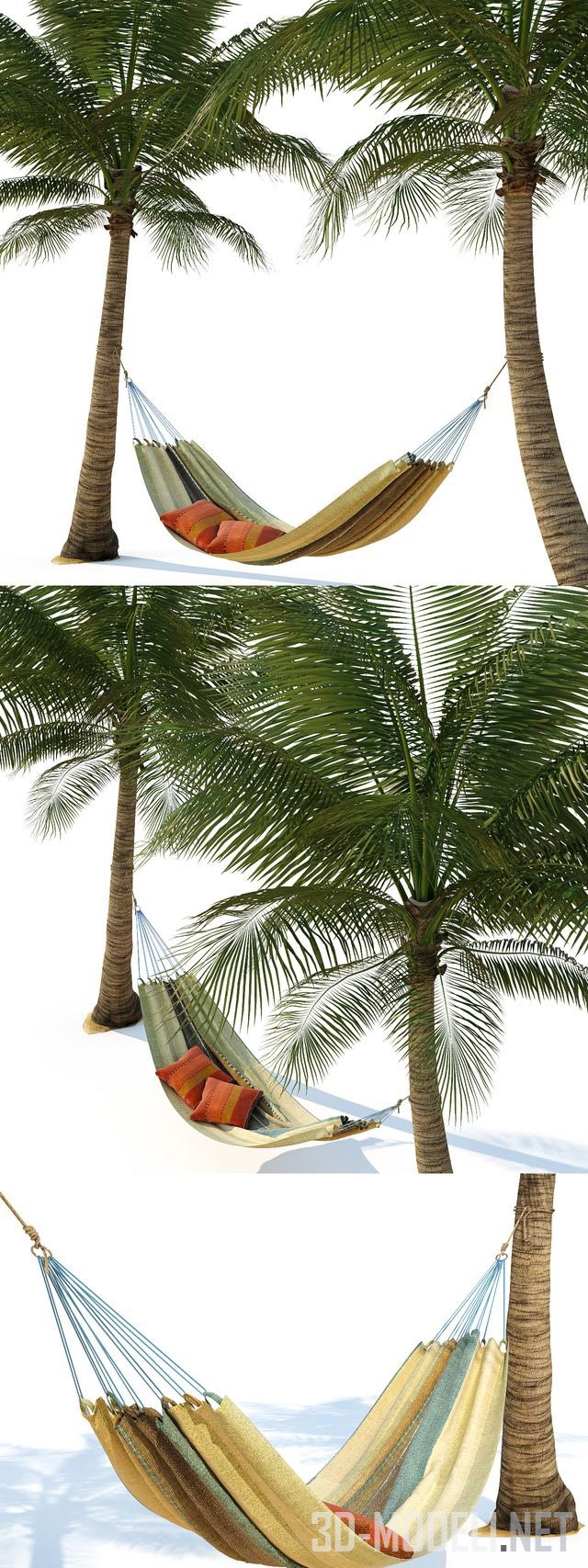 Идеальный сет для летнего отдыха. В основе набора две высокие тропические пальмы и гамак между ними. Полотно гамака в полоску. в оранжевых тонах подушки гармонично дополняют его.