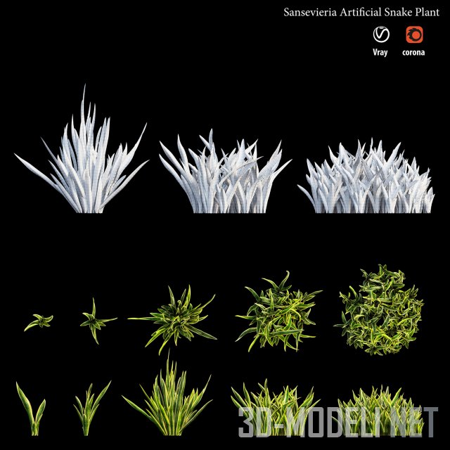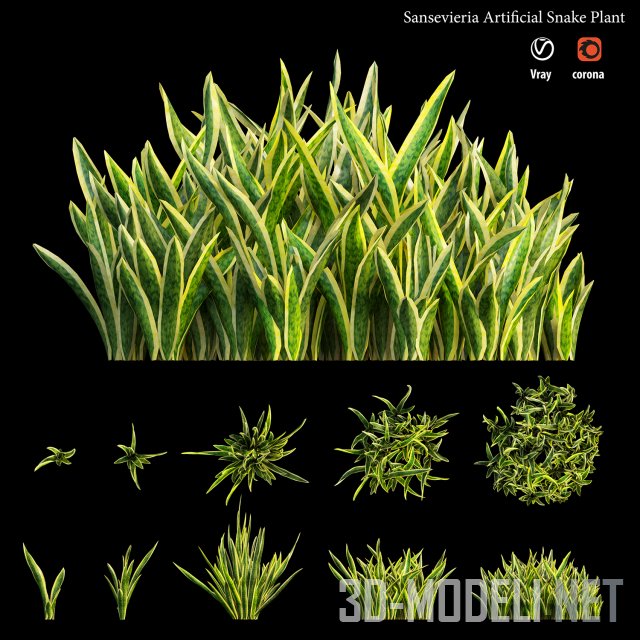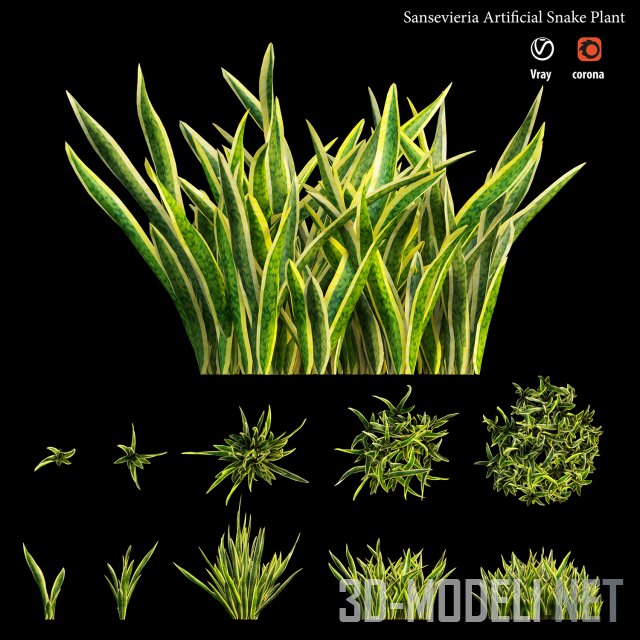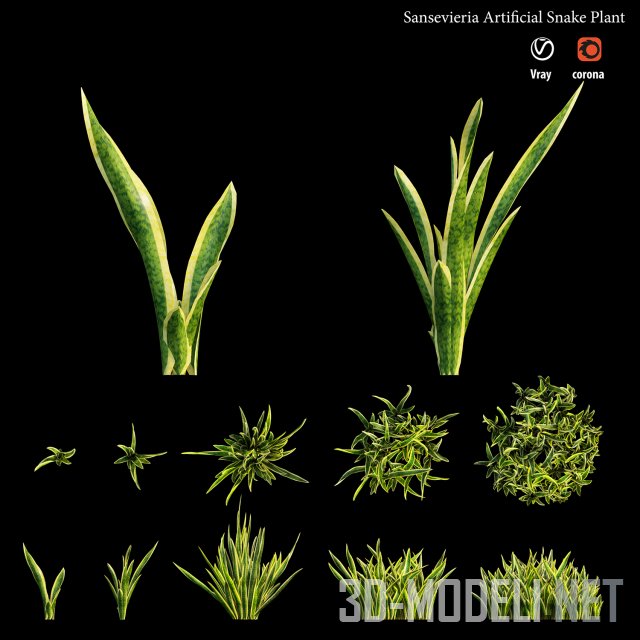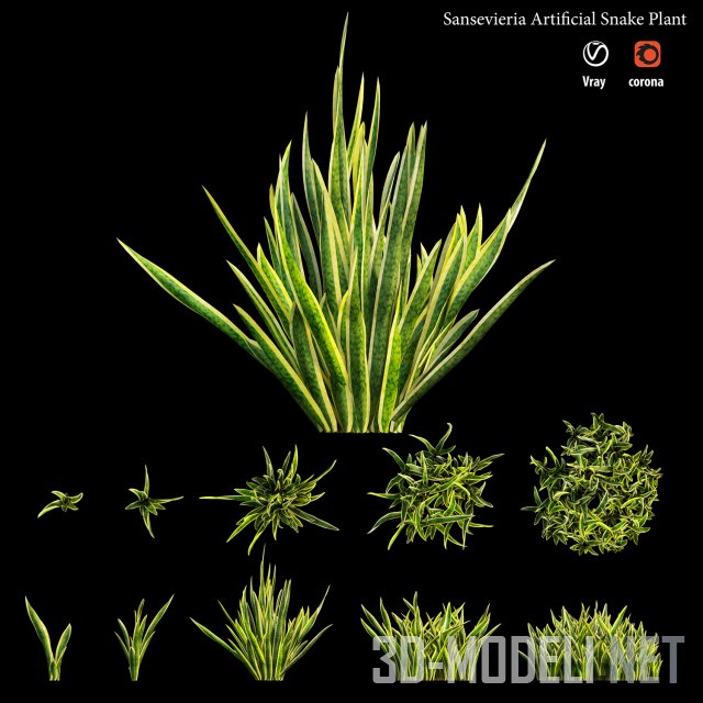 Сансевьерия змеиная с пестрыми зелеными листьями и желтой окантовкой на острых листьях. Представлены пять вариантов одиночного растения и в группах с разным количеством. Высота растения от 0,3 до 0,8 м.