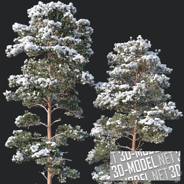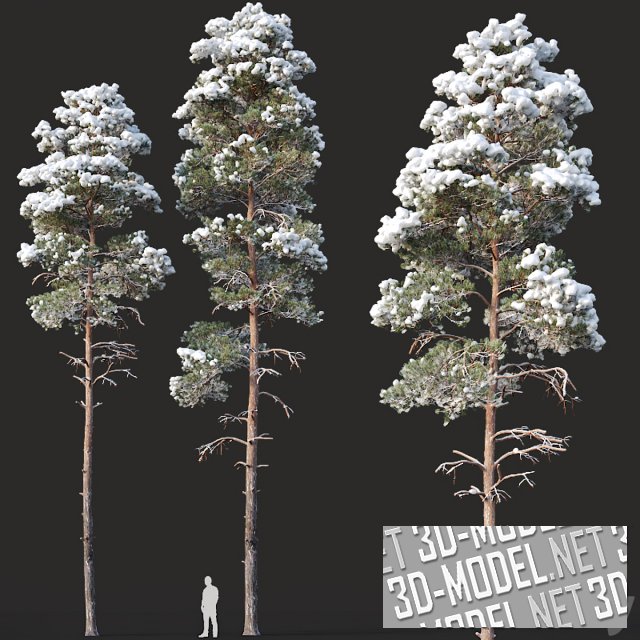 Pinus sylvestris) зимой. Три высоких дерева (16-18м) щедро присыпаны снегом.