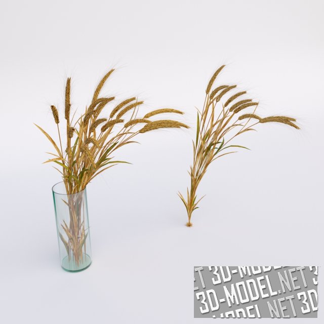 Золотистые сухие, с остатками зелени, колосья пшеницы в двух вариантах: в виде кустика с несколькими колосками, для формирования пшеничного поля в естественных условиях и в виде букета из колосков на стеблях, размещенного в высокой стеклянной цилиндрической вазе.