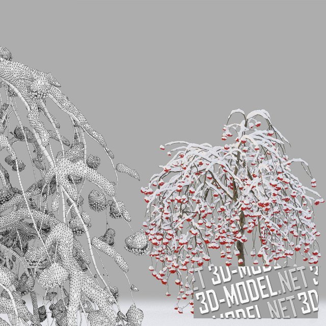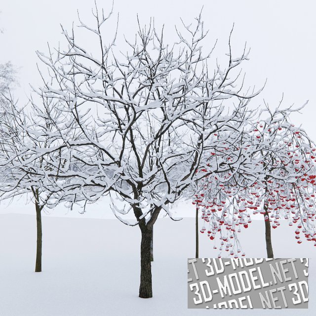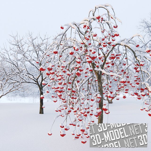 Пять деревьев в период зимы (без листвы), с налипшим на ветки снегом. Высота деревьев составляет от 1,3 до 3 метров. Красные ягоды рябины под снегом смотрятся замечательно.