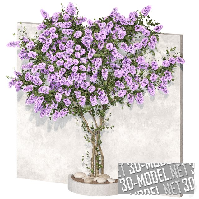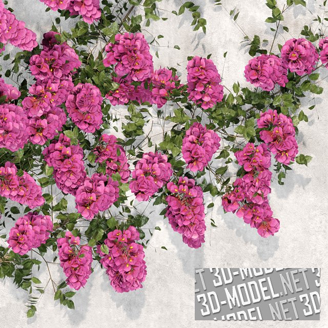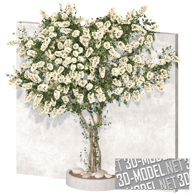 Крупный куст садового декоративного растения - бугенвиллия с густыми гроздьями соцветий. Растение высажено в небольшую полукруглую клумбу с бортиком из бетона, стыкующуюся к серой бетонной плите забора. Поверхность грунта в клумбе декорирована несколькими огальтованными камнями среднего размера. Представлены три цвета бугенвиллии: малиновый, белый и сиреневый. Габарит сцены: 490,36х189,95х462,79см.