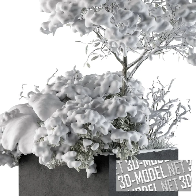 Композиция состоит из нескольких элементов. В верхней части находится древовидное растение с разветвленными ветвями в снегу. Ниже, вокруг основания, расположены кусты (пучки травы), также покрытые снегом. Снег выглядит густым и объемным. Растение помещено в современный квадратный горшок из материала, с текстурой темного матового камня. Горшок имеет четкие геометрические формы и минималистичный дизайн.
