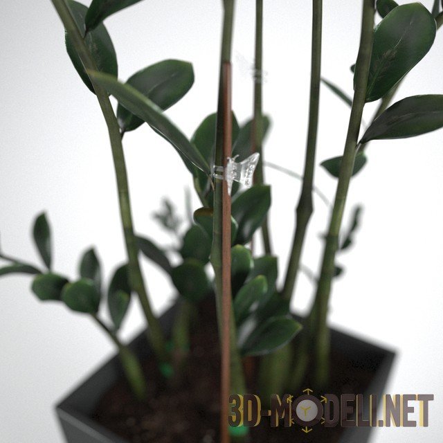 Домашнее растение замиокулькас, в высоком белом горшке современной формы. Высота с горшком составляет 65 см. Растение отлично смотрится в любом интерьере.