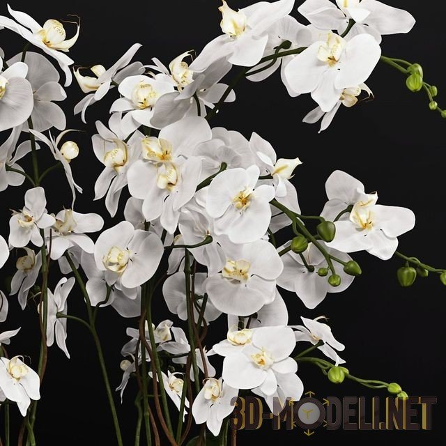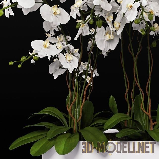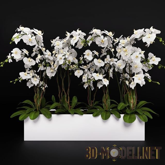 В прямоугольном белом лотке в современном минималистическом стиле разместились несколько орхидей. Фаленопсисы усыпаны характерными цветками белого цвета и создают гармоничное сочетание белого и тёмно–зелёного.