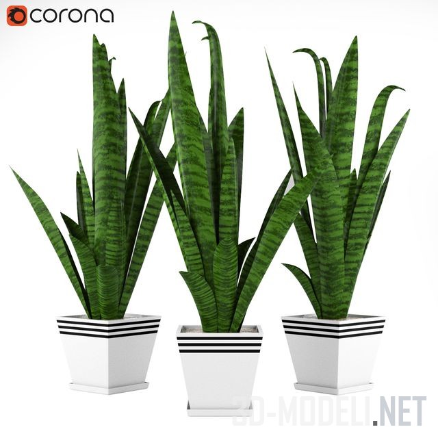 Три керамических белых горшка, квадратных в сечении. В верхней части кашпо декорированы тремя темными полосками. В горшках – три варианта сансевьеры («Тещин язык»), с длинными пестрыми сочными листьями.