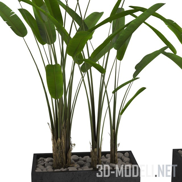 Несколько высоких кустов стрелиции в двух контейнерах: прямоугольном и квадратном. Кашпо современные, черные. Верхний слой грунта декорирован серой галькой. В прямоугольном горшке растут три куста. В квадратном – один куст.