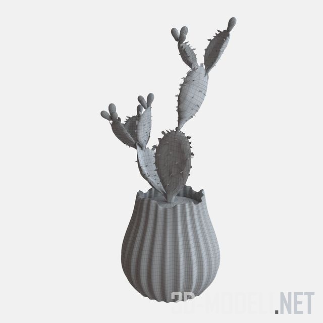 Черное глянцевое кашпо современного цветочного горшка выполнено с неровным верхним срезом и выпуклыми вертикальными сегментами. В горшке растет высокий кактус опунция. На верхушках разместились небольшие плоды.
