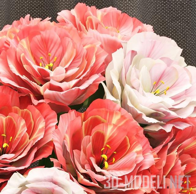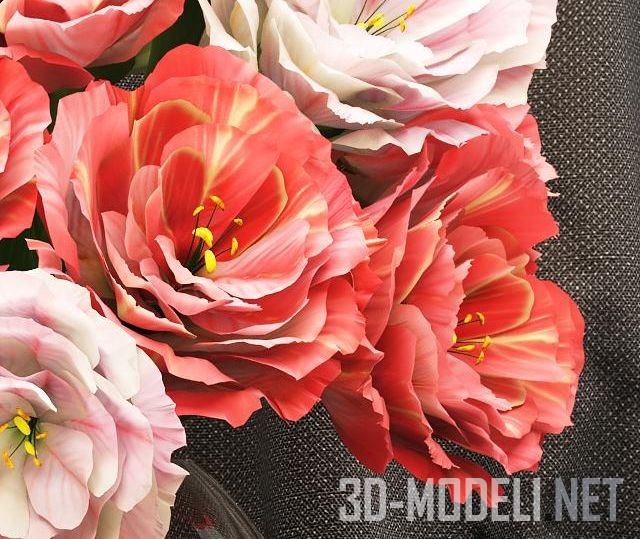 Большой и пышный букет из красных и бело–розовых цветов в классическом стиле. Цветы размещены в шарообразной вазе из прозрачного стекла. Модель высокого качества изготовления, с текстурами в архиве.
