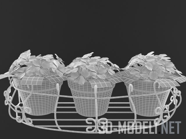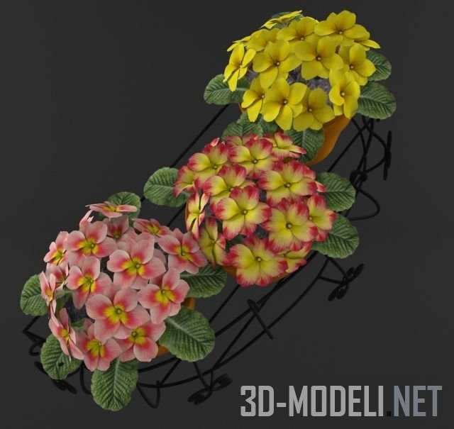 Три очаровательных глиняных светло-рыжих небольших горшочка с нежными цветами примулы розового, желто-красного и желтого цвета. Горшочки стоят в небольшом кованом контейнере черного цвета. Прекрасное дополнение для небольшого загородного дома.