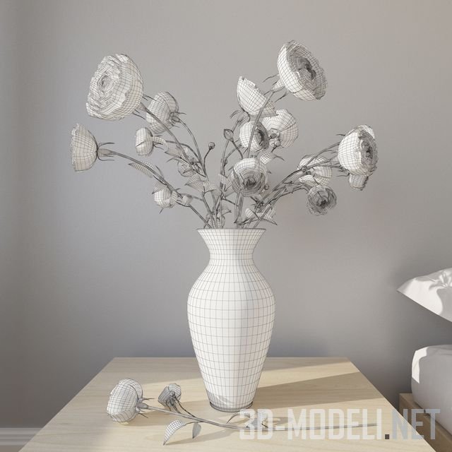 Нежный и элегантный букет роз, изысканность которого замечательно подчеркнута фигурной вазой белого цвета. Одна из роз живописно расположена на столике, что придает композиции еще большую достоверность и реализм.