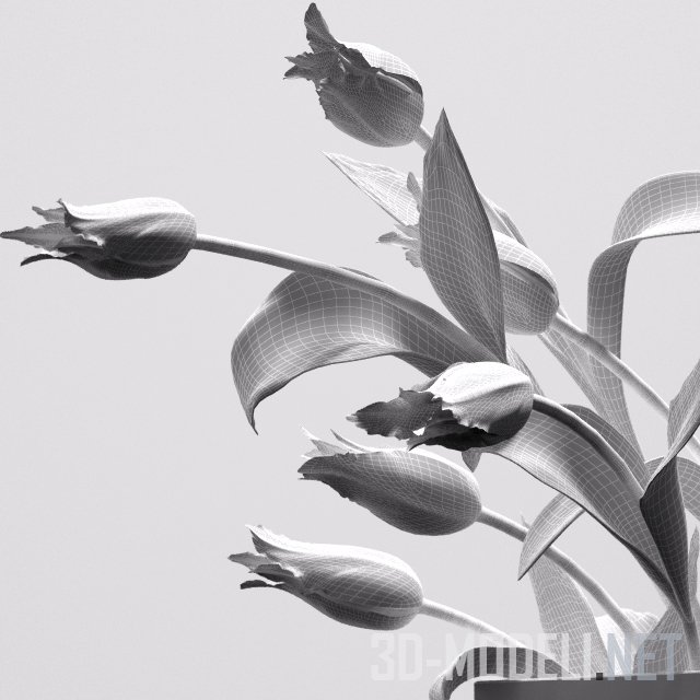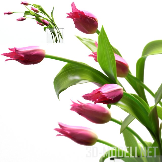 Прекрасные и свежие, молодые королевские тюльпаны с махровыми краями и светло-зелеными крупными листьями. Цветы слегка наклонены, что создает динамичное впечатление. Букет послужит реалистичным декоративным дополнением к интерьеру любого помещения.