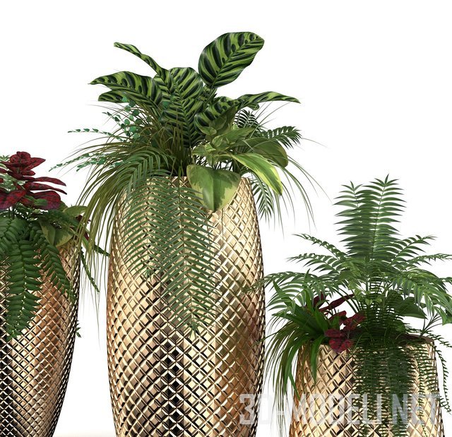 Готовый набор для декора интерьера - три составных букета из комнатных растений в золотистых рифленых горшках разного размера. В комплекте идет полный набор текстур, модель имеет качественные Vrayшейдеры и готова для использования.