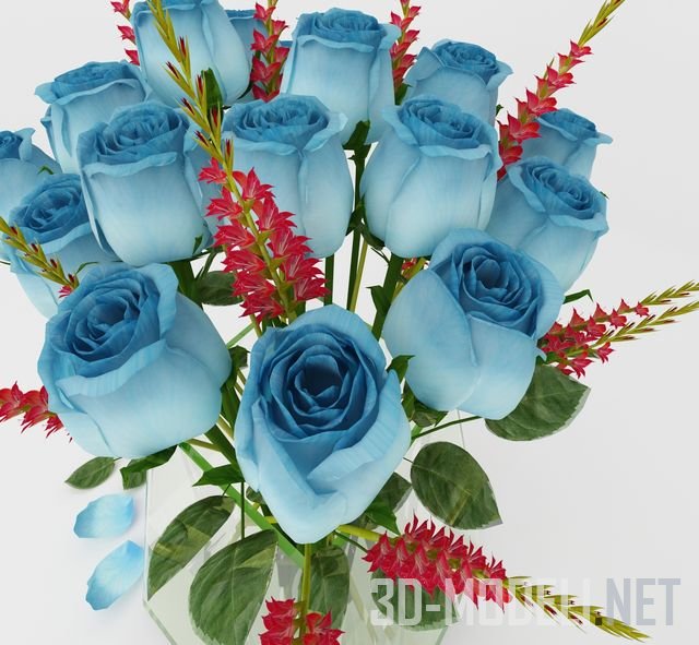Букет фантастических голубых роз с зелеными листьями и красными мелкими цветами, похожими на люпин. Букет стоит в квадратной прозрачной вазе из толстого стекла. Несколько роз рассыпано по поверхности и две стоят в узкой вазочке рядом.