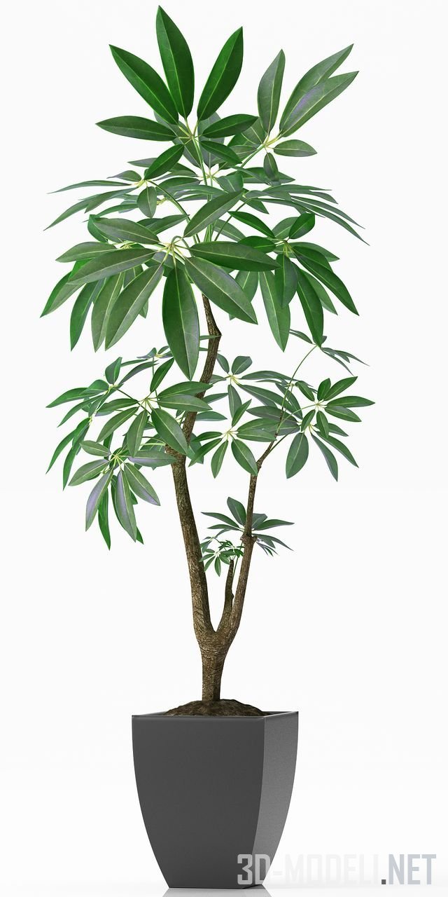 Комнатное растение с древовидным стволом и зелеными листьями характерной формы - пахира. Представлены три варианта кашпо: минималистичный белый цилиндр, графитового цвета четырехгранный горшок, сужающийся книзу и деревянный, украшенный обильной резьбой сосуд в классическом стиле.