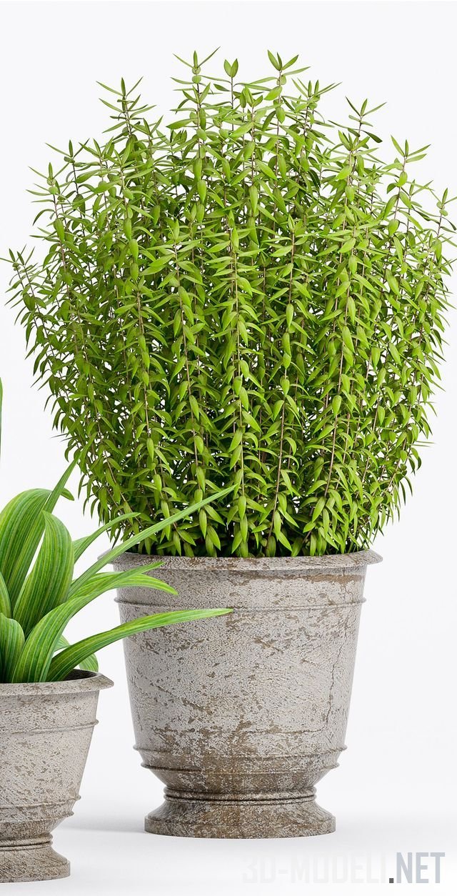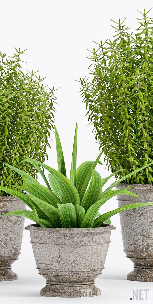 Три больших садовых горшка с рустикальной поверхностью керамики с высаженными в них растениями. В двух горшках - вертикальные стебли с мелкими зелеными листочками, образующими пушистые кусты. В третьем - растение с плотными удлиненными листьями с продольными прожилками.