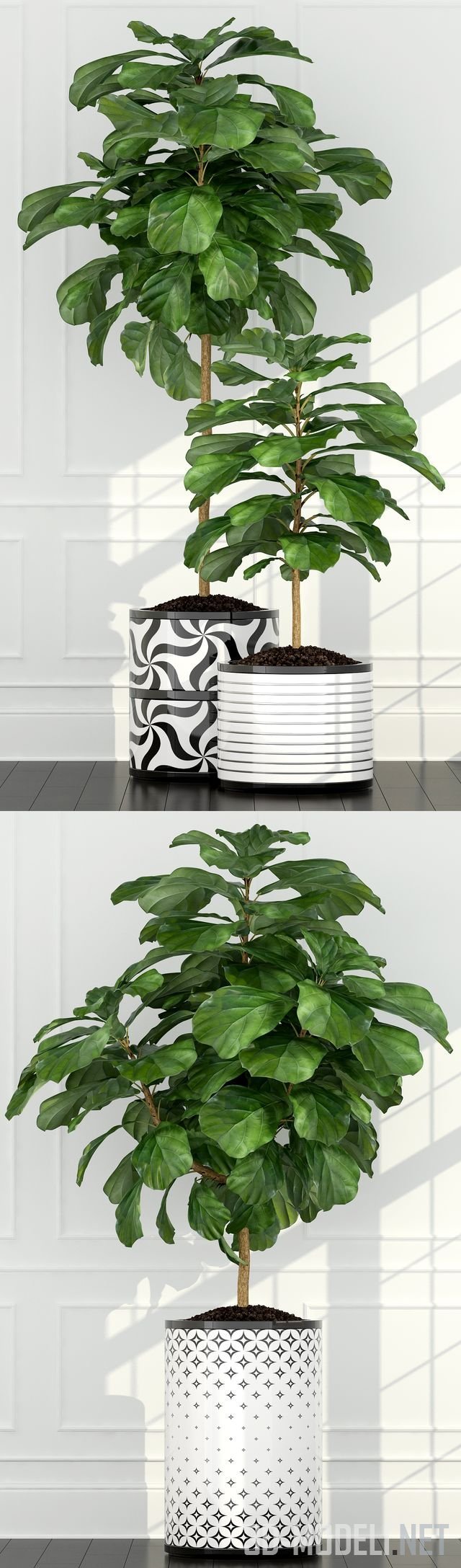 Три горшка с черно-белым этническим декором на боках. В горшках - взрослые растения фикуса лировидного с одеревеневшим стволиком и крупными зелеными листьями с волнистой кромкой.