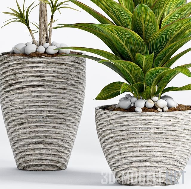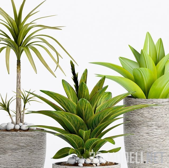 Набор из трех видов комнатных экзотических растений с плотными листьями. Горшки, разной высоты и диаметра, отделанные рустикальными горизонтальными бороздками. Грунт декорирован крупной белой галькой.