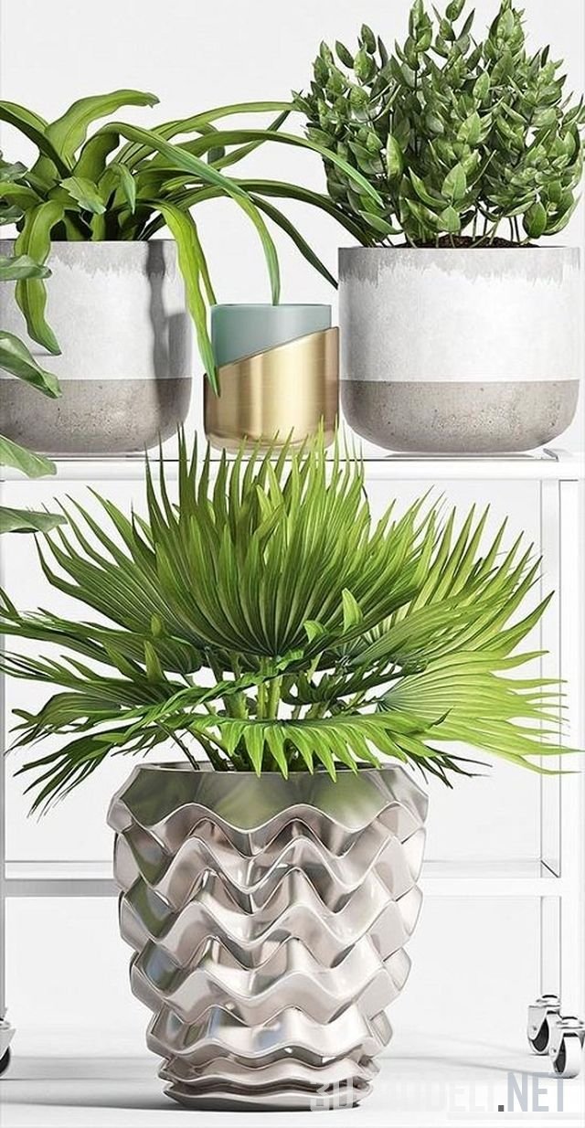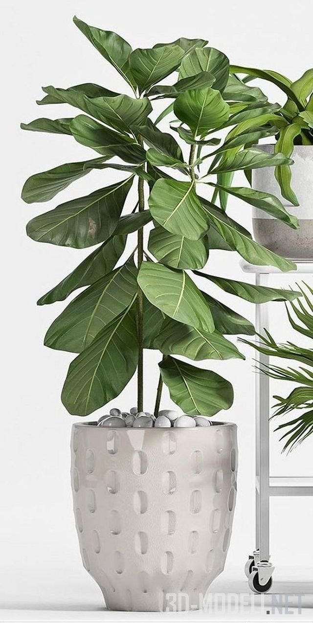Композиция из нескольких комнатных растений в декоративных кашпо. Пара горшков и подсвечник стоят на легком мобильном сервировочном столике из хромированного металла. В больших горшках на полу - высокий куст фикуса лировидного с характерными крупными дубовидными листьями и пальма ливистона с жесткими веерными листьями.
