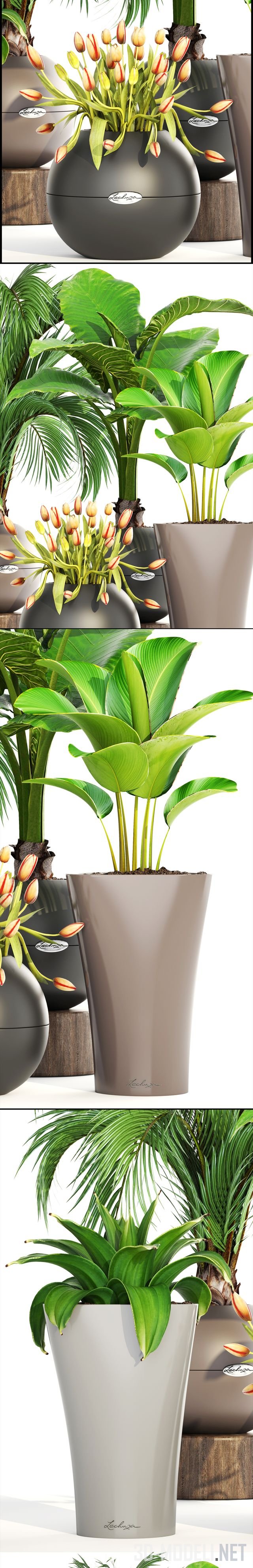 Реалистичная 3d модель экзотических растений в горшках. Набор можно использовать для домашнего интерьера, зимнего сада, террасы, для декорирования ресторана, офисных помещений и пр. Среди растений присутствует пальма Hedyscepe canterburyana, агава, алоказия крупнокорневая, калатея и тюльпаны. Горшки от компании Lechuza.