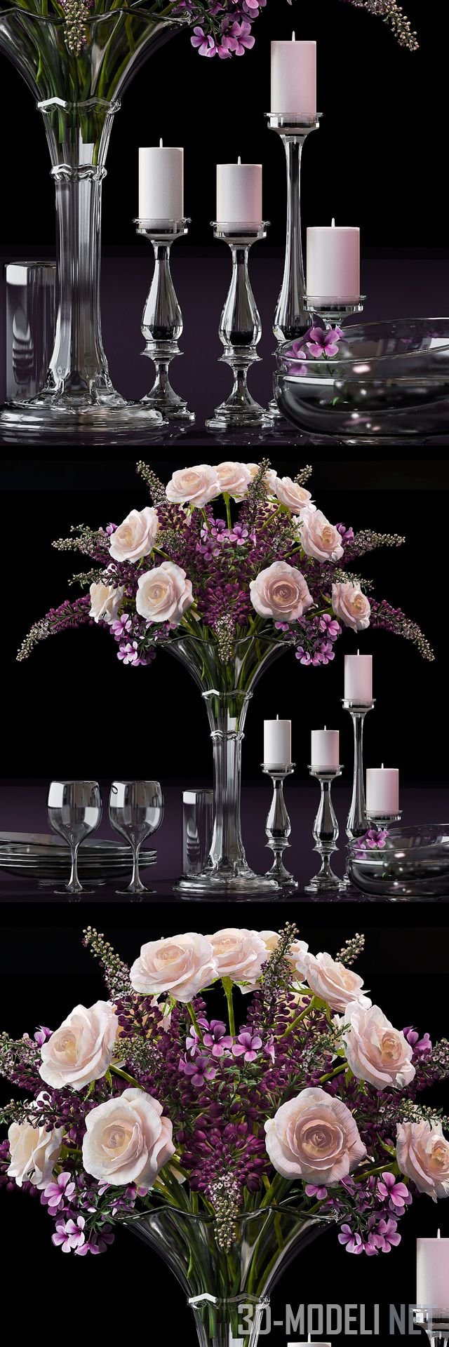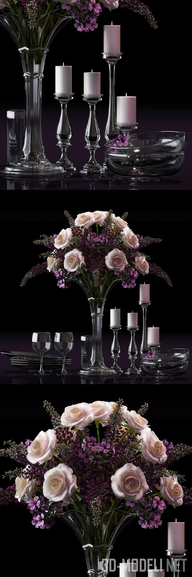 3d модель декоративного набора, в центре которого ваза с розочками. Букет дополнен свечами и посудой, и будет красиво смотрится в интерьере столовой.