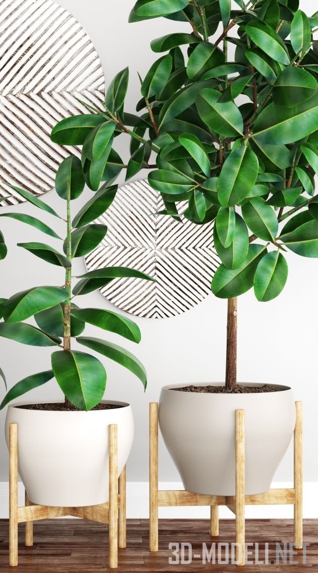 Несколько фикусов с крупными овальными листьями, с разными сформированными кронами. Большие керамические белые горшки для фикусов установлены на деревянных подставках. Стены украшают круглые рельефные рустикальные панно, создавая с цветами гармоничную композицию в этно-стиле.